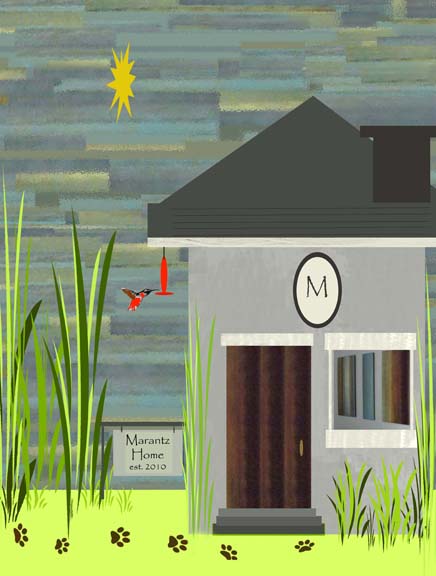 By necessity, this has to be a somewhat traditional piece, so I finished with the lime green lawn, foliage, a sign with the owners' name [and their initial on the home], and a hummingbird supping at the home's hummingbird feeder under a beautiful Orange County sun.